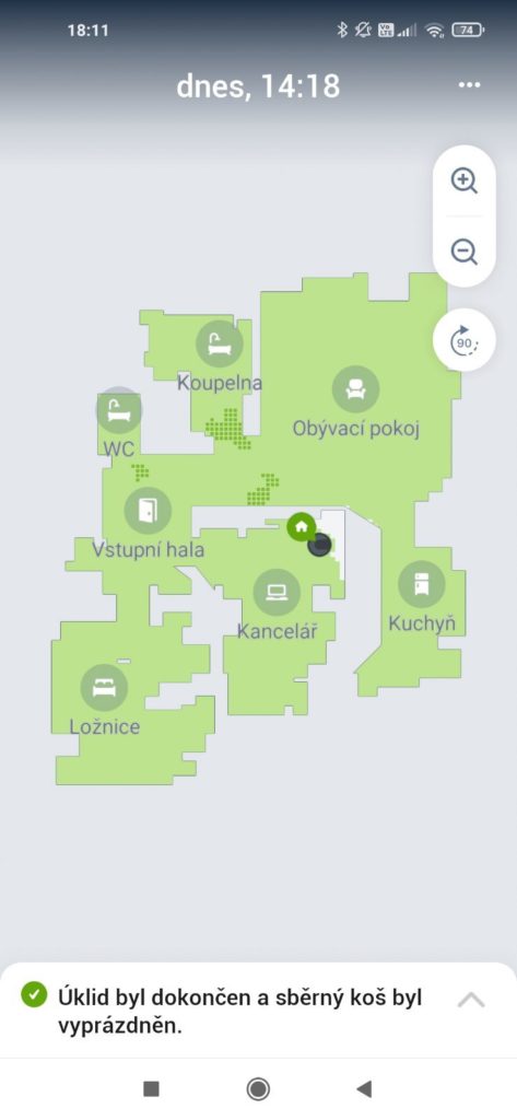 Roombu môžete ovládať aj pomocou aplikácie iRobot pre Android a iPhone, ktorá vám umožňuje nastaviť plán upratovania, zastaviť upratovanie, alebo skontrolovať priebeh. To je naozaj užitočné, keď ste mimo domova, pretože môžete upratovať bez toho, aby vám vysávač prekážal a viete, že prichádzate domov do uprataného bytu. Po dokončení aplikácia poskytne podrobnú mapu oblastí, ktoré boli upratané. U modelov Roomba to vyzerá takto: