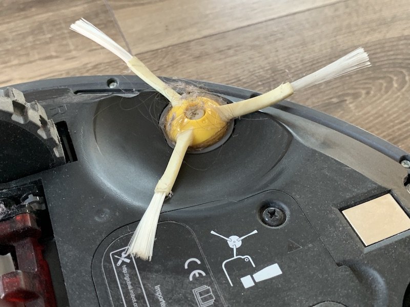 Nečistoty zachytené na bočnej kefke vysávača iRobot Roomba 976.