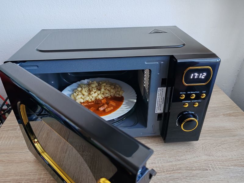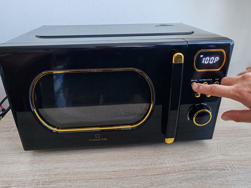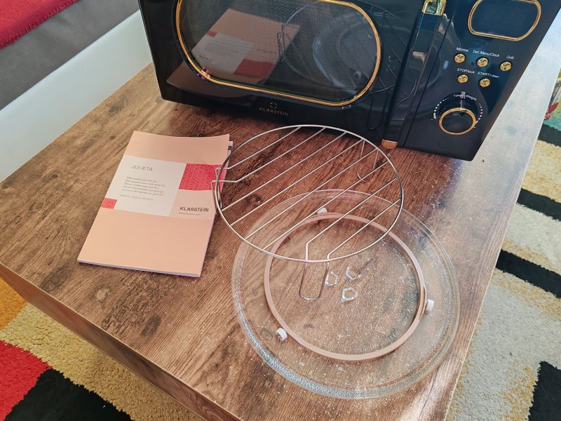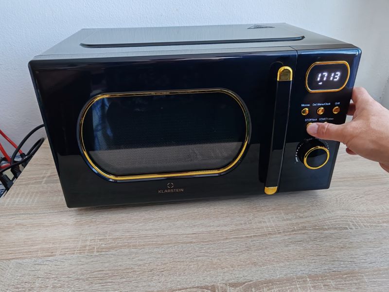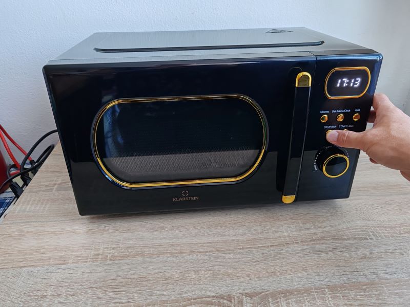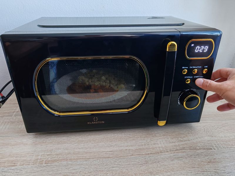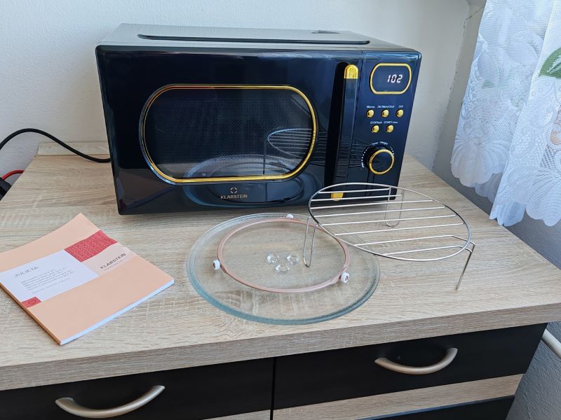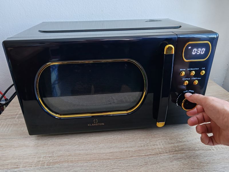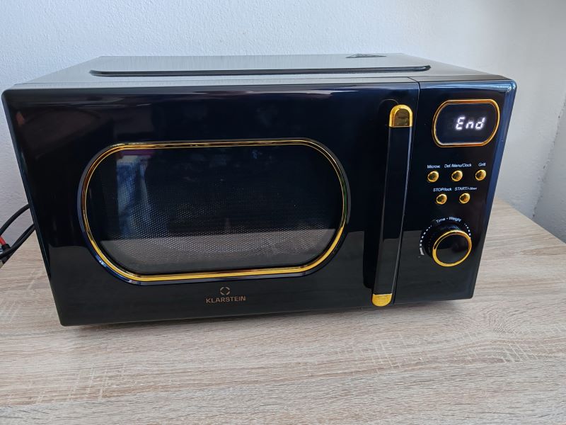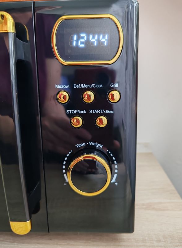 Klarstein Julieta zaujme už na prvý pohľad. Ja ju mám v čierno/zlatom vyhotovení. Zaoblené okienko na dverách, aj pri ukazovateli času, decentné „zlaté“ tlačidlá a čierne telo s jemnými retro detailmi robia z tejto mikrovlnky doplnok, ktorý v kuchyni spoľahlivo pritiahne zrak.