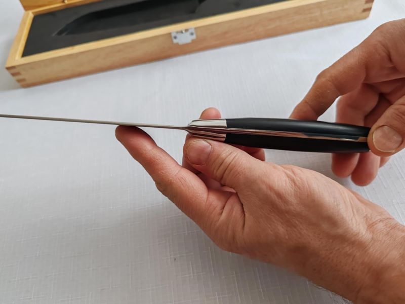 A rozdiel v porovnaní s bežným nožom hneď vidieť a cítiť. Hneď po prvom uchopení totiž pochopíte, že v ruke držíte naozaj kvalitný kus najdôležitejšieho kuchynského náčinia. Čepeľ je robustná a zároveň dobre vyvážená, takže pri rezaní máte ozajstný pocit kontroly (pekne od špičky k päte noža, aj s miernym pohojdávaním). Široká santoku čepeľ potom umožňuje pohodlne sekať, krájať aj drobiť potraviny bez toho, aby ste naň museli príliš tlačiť. A vďaka tomu aj dobre poslúži ako lopatka – z dosky rovno do hrnca či na panvicu.