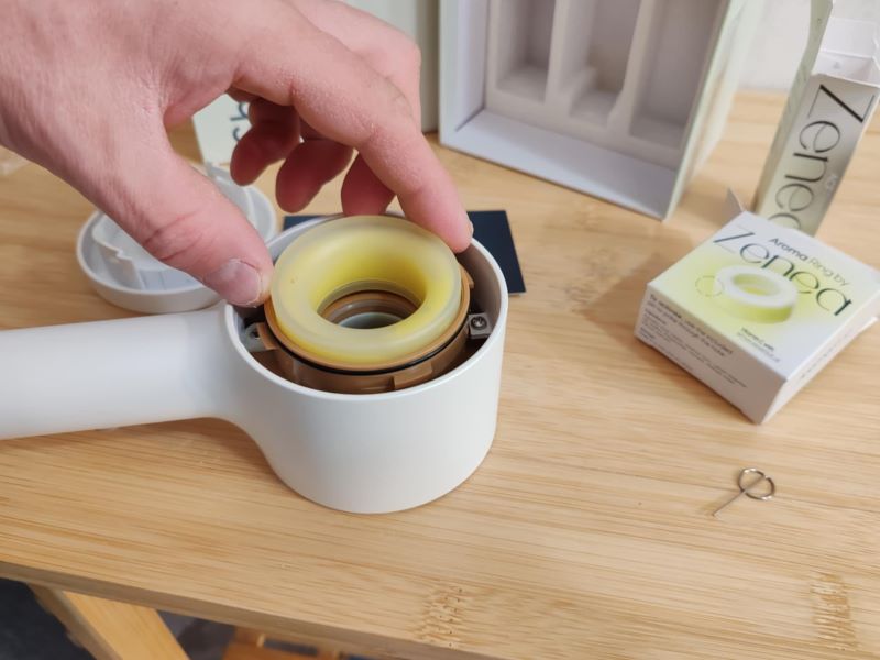 - Potom odskrutkujte hornú časť hlavice, prepichnite pripravený aroma krúžok (ak teda chcete využívať arómu, nemusíte, vaša voľba), a vložte ho dovnútra vyčnievajúcou časťou nahor.